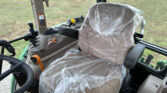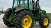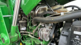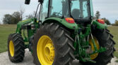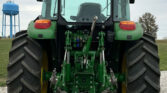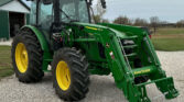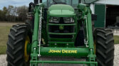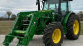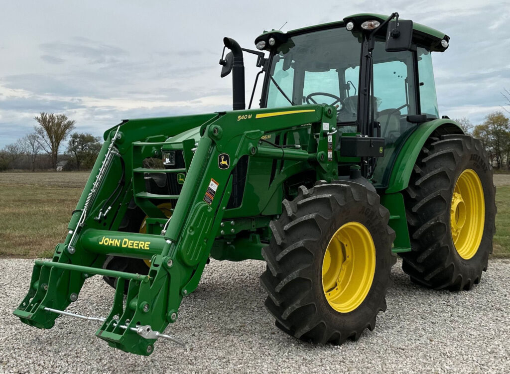 The John Deere 540M loader, equipped with quick attach, is ideal for material handling. It also includes a bale spear and a 72″ bucket for various lifting tasks. Joystick controls offer easy operation of the loader and attachments.